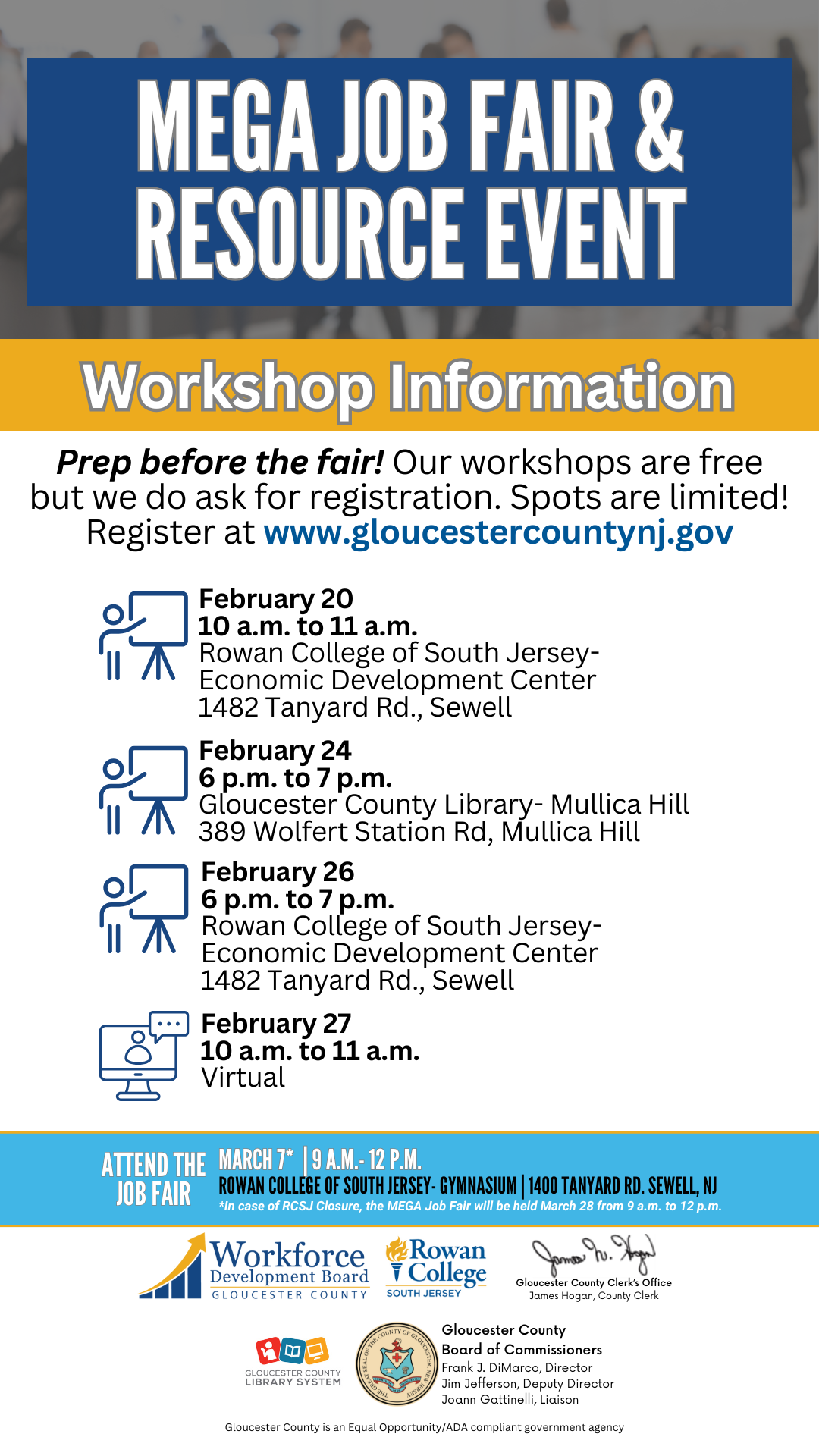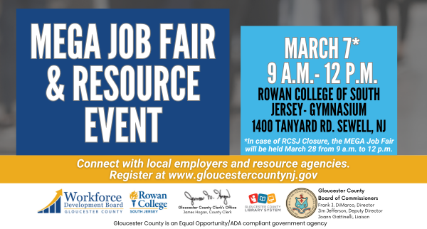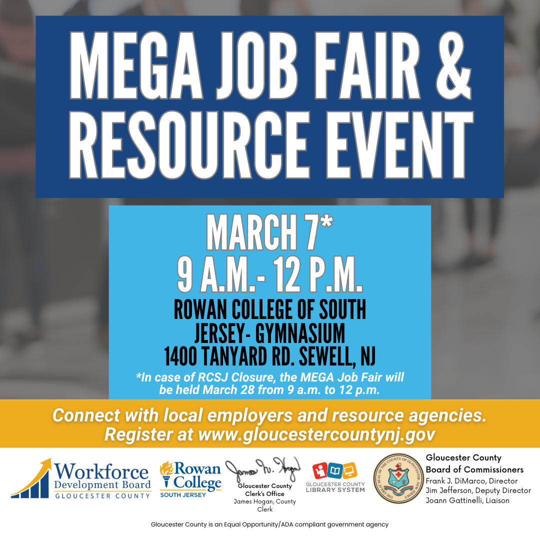 Ready for a career change or looking for new opportunities? Join the Gloucester County Workforce Development Board on March 7 at Rowan College of South Jersey for the MEGA Job Fair & Resource Event! Meet top employers, explore job openings, and access valuable career resources to help you succeed.