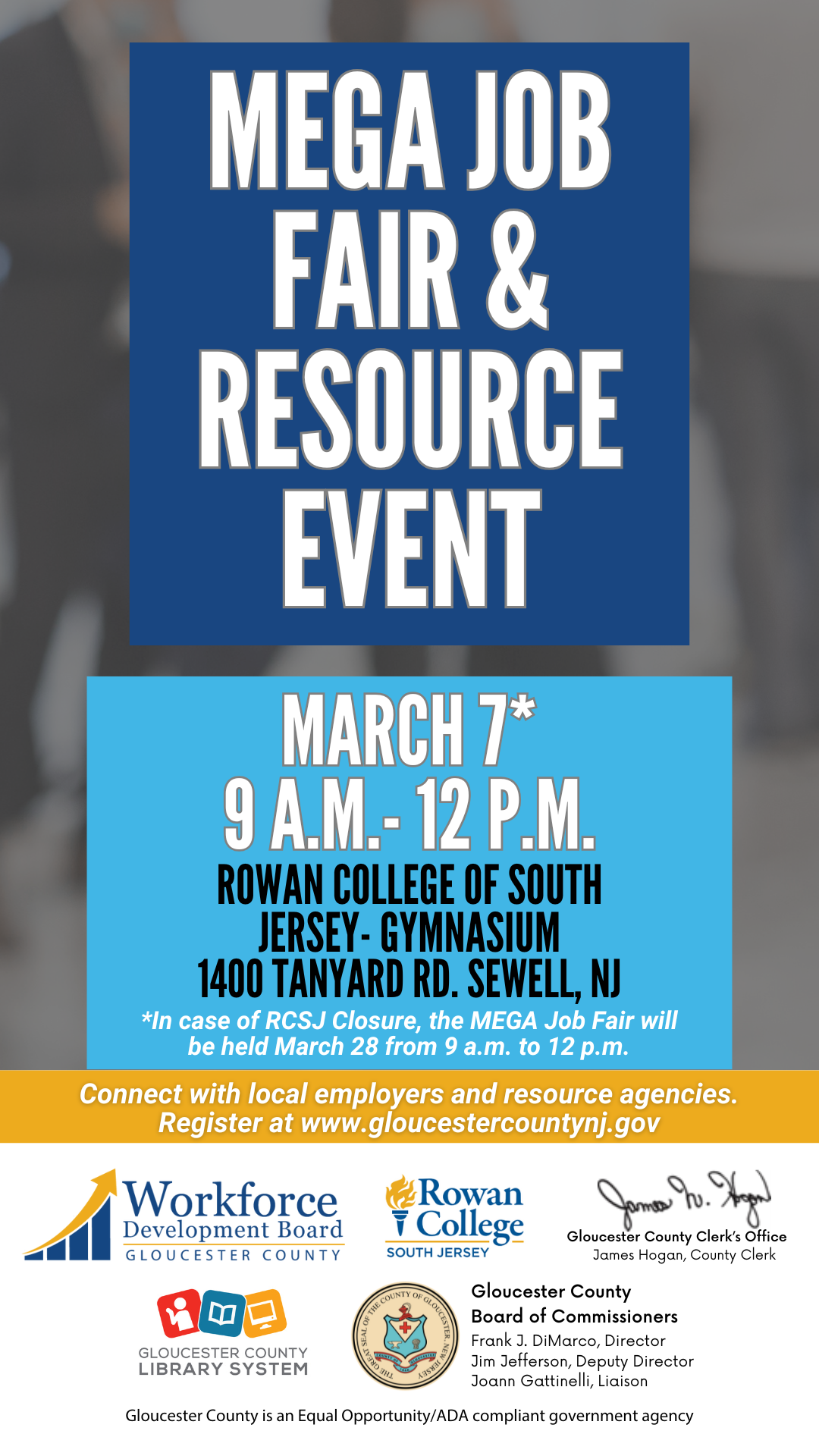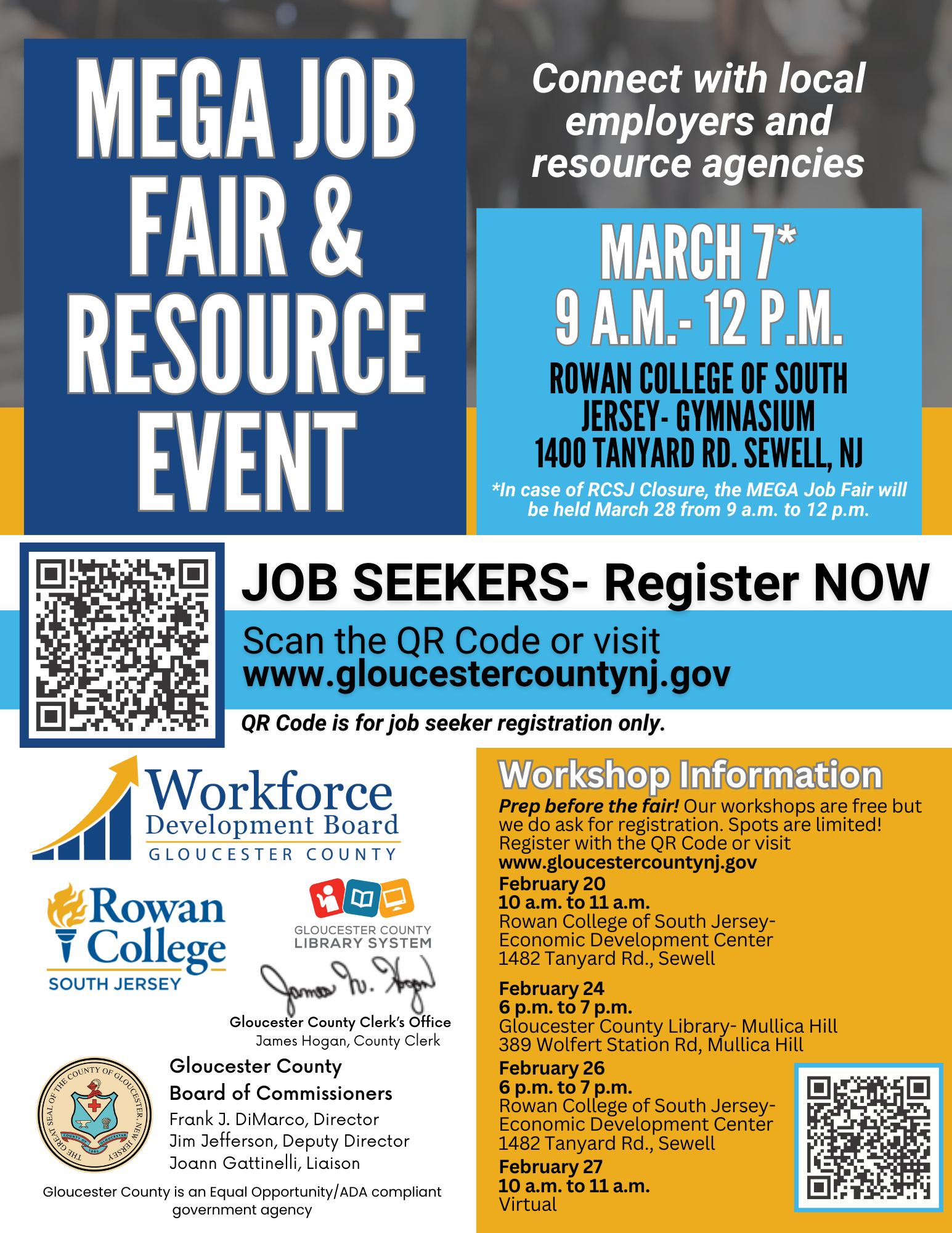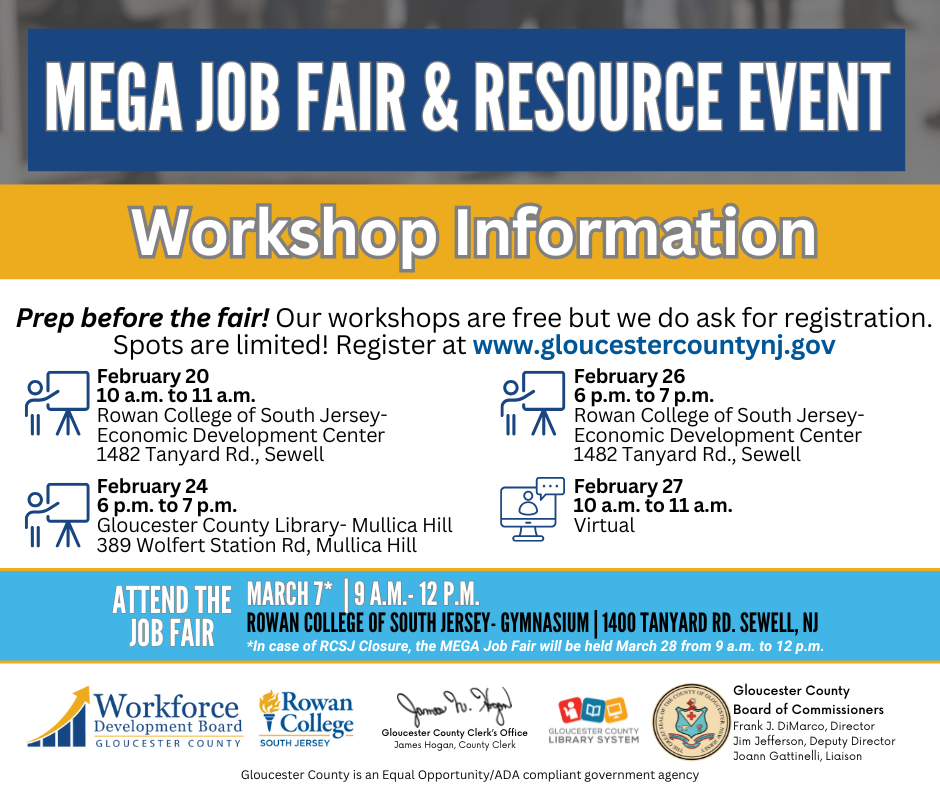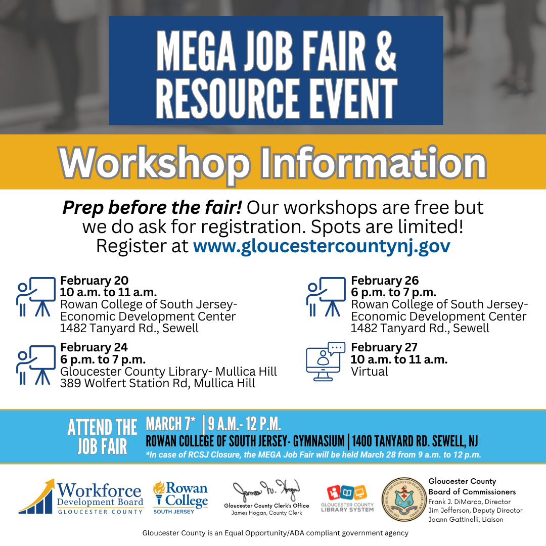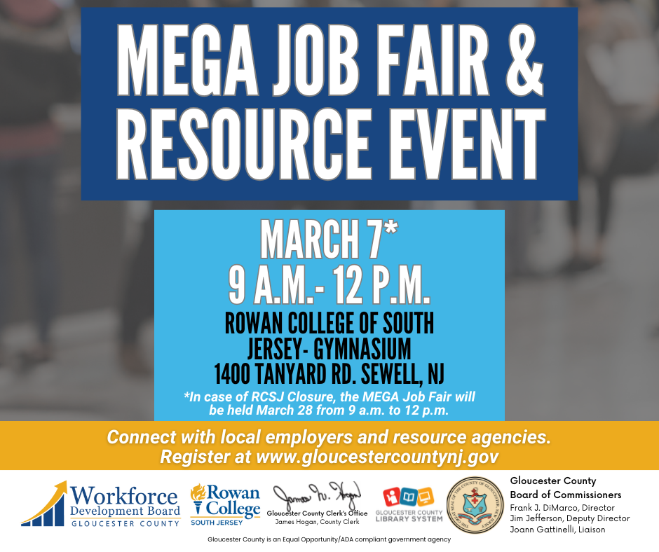 Ready for a career change or looking for new opportunities? Join the Gloucester County Workforce Development Board on March 7 at Rowan College of South Jersey for the MEGA Job Fair & Resource Event! Meet top employers, explore job openings, and access valuable career resources to help you succeed.